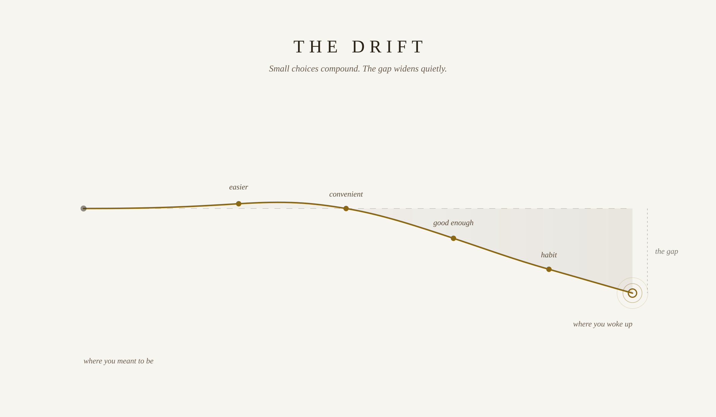 I’m not saying this to make you feel bad. It would be almost impossible to avoid entirely. Some drifting is inevitable, even healthy. You can’t be deliberate about everything all the time — and honestly, you shouldn’t try. So there’s no point in beating yourself up about how you got here. That’s not the work.