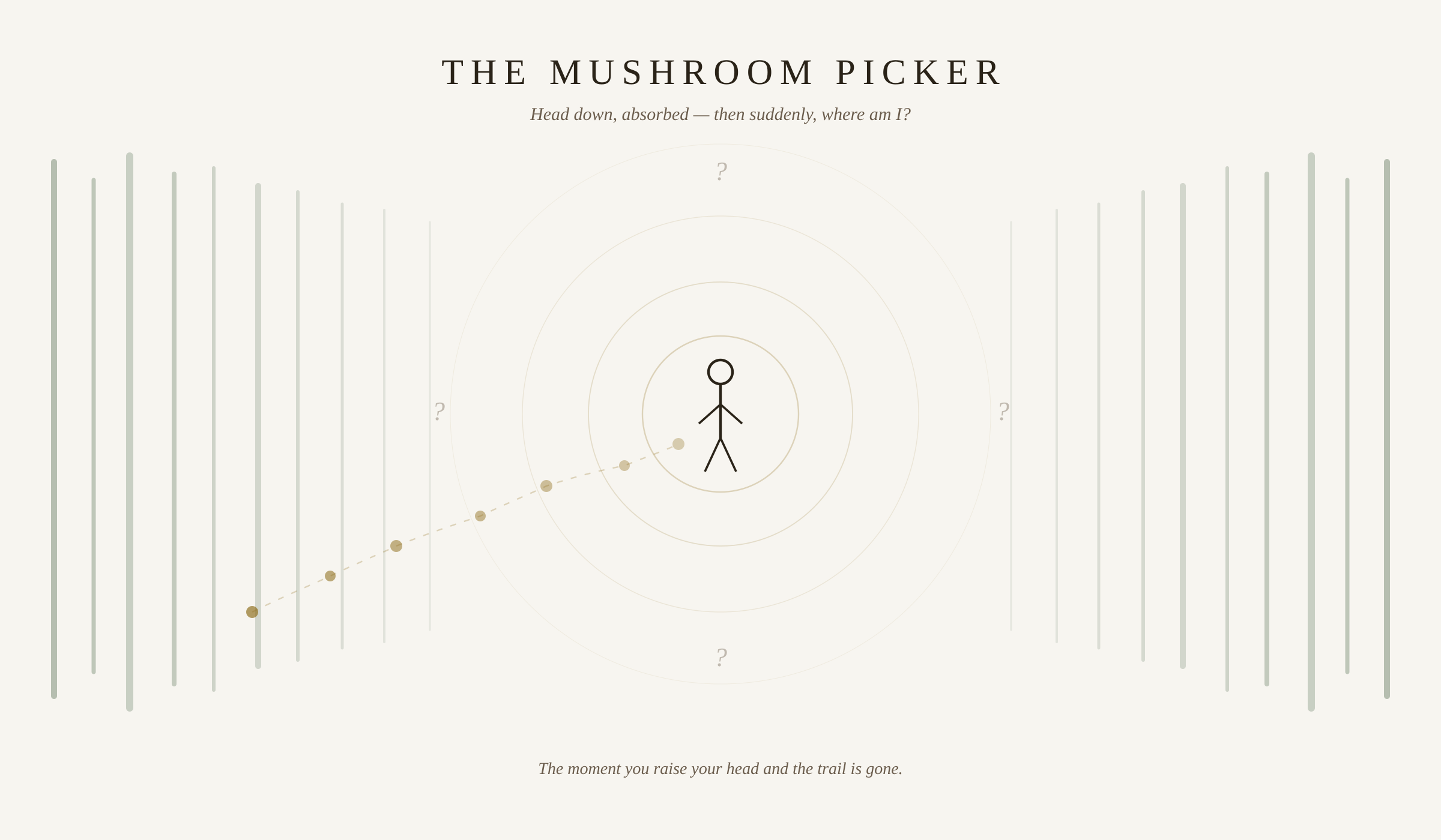I think this is what happens to many of us. You’re the mushroom picker. You were absorbed in what was right in front of you — one thing after another, each one interesting or necessary or simply there — and then one day you raise your head and the trail is gone. You can see and name the things around you, but you don’t know how you got here. And figuring out how to get out is a completely different problem than figuring out what brought you in.